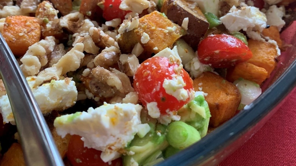 Zoete-aardappelsalade met witte kaas en walnoten (hoofdgerecht)